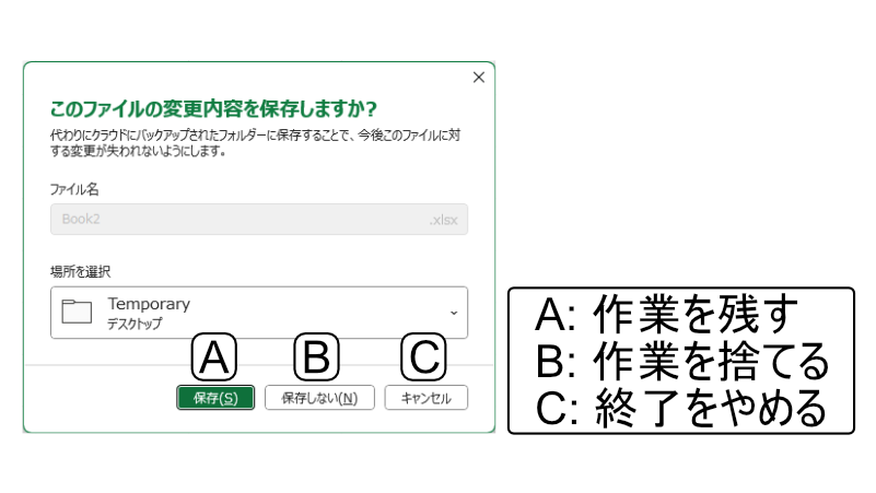 - 保存しない → 作業を捨てる(完全に消えます)