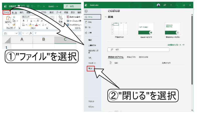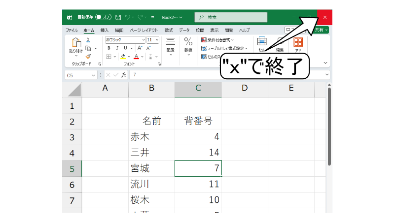 - ウィンドウを閉じる → Excelを終了します