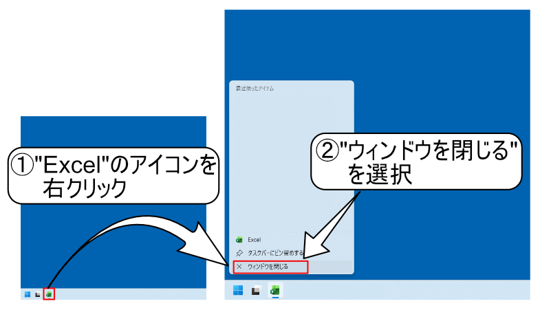 タスクバーの”Excelのアイコン”で右クリックします。
