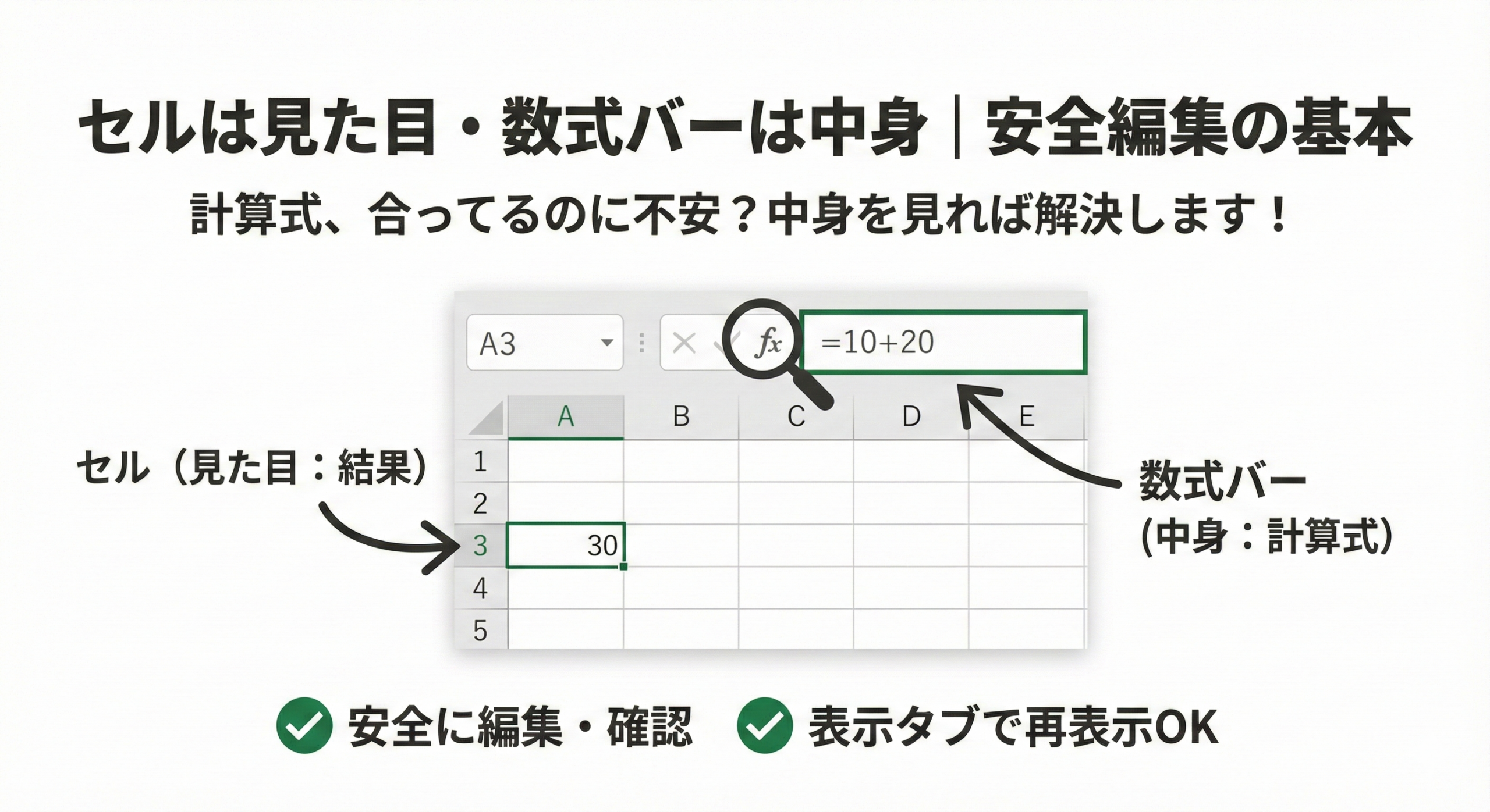 - 「セルは30、数式バーは=10+20」と口に出す