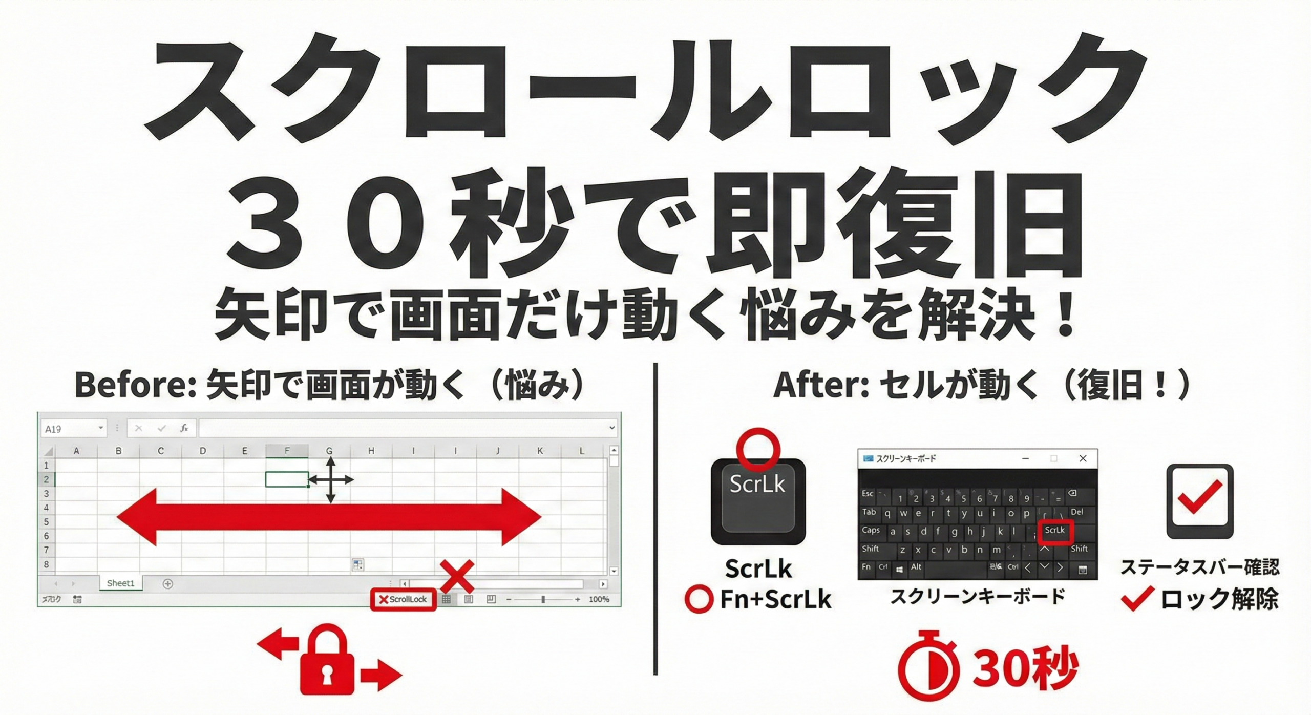 | Scroll Lock ON | 画面がスクロール | 大きな表を眺める(カーソルは固定) |