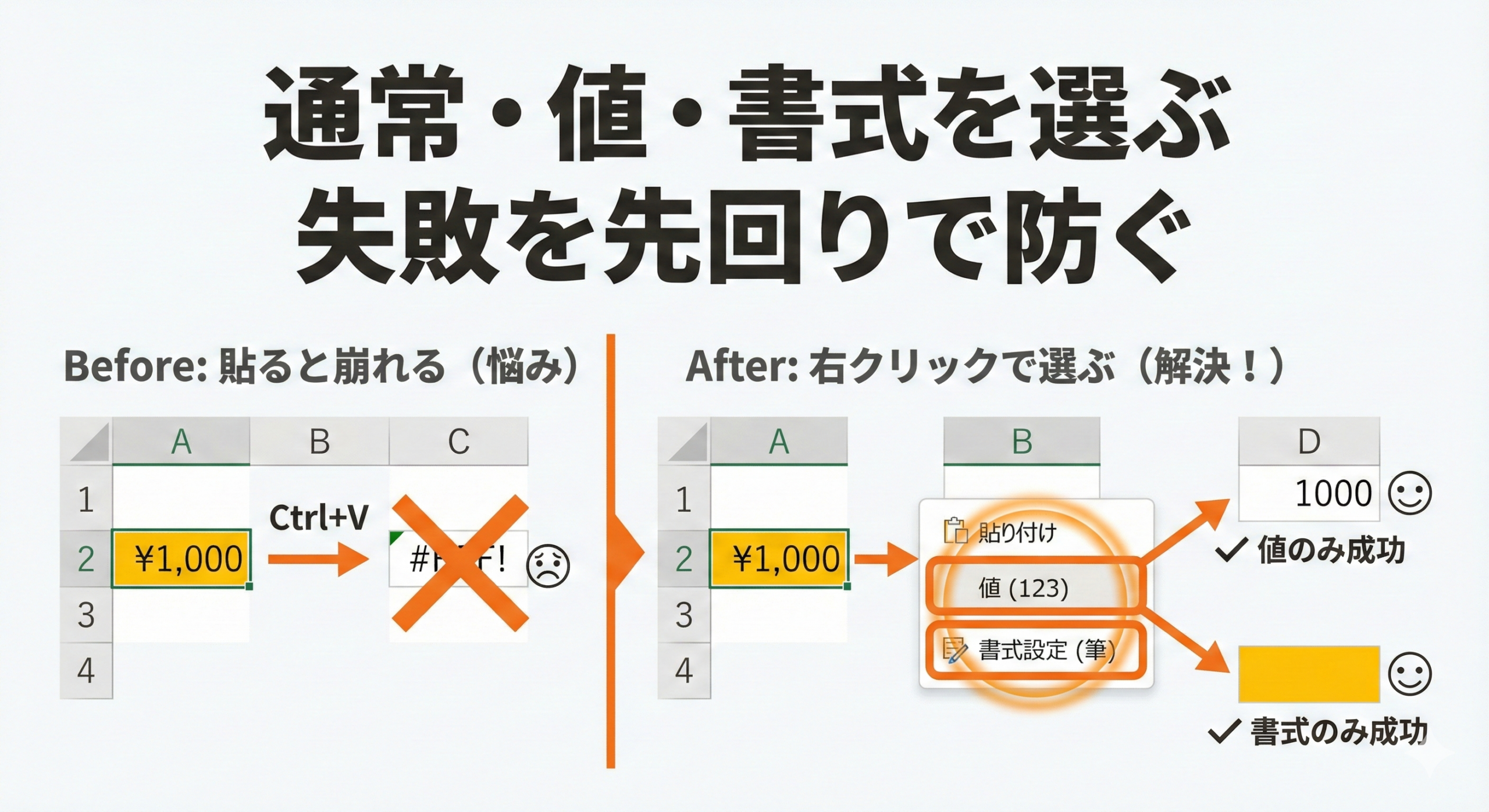 - 値(123)=結果だけ、書式(筆)=見た目だけ