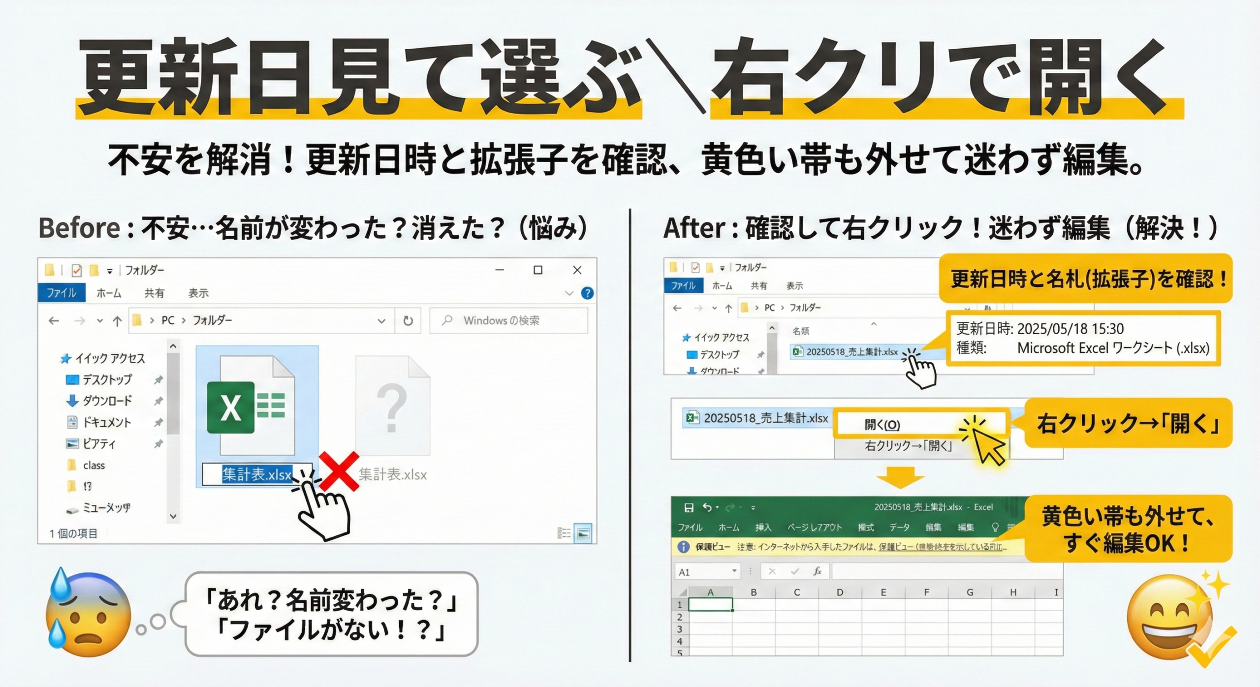 - 更新日時と拡張子を確認してから開く