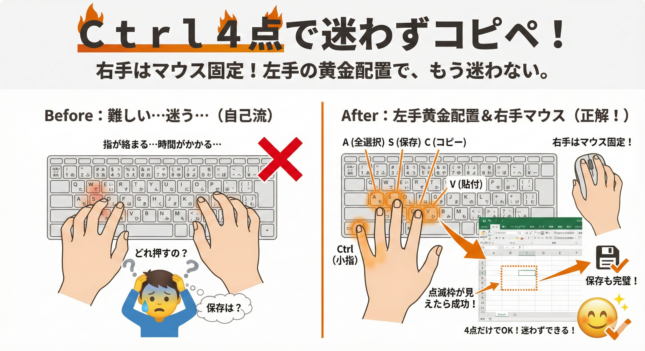 3 つのキーをスムーズに使い分け、点滅枠を確認しながらコピー→貼り付けが完了でき、保存まで一連で実行できた