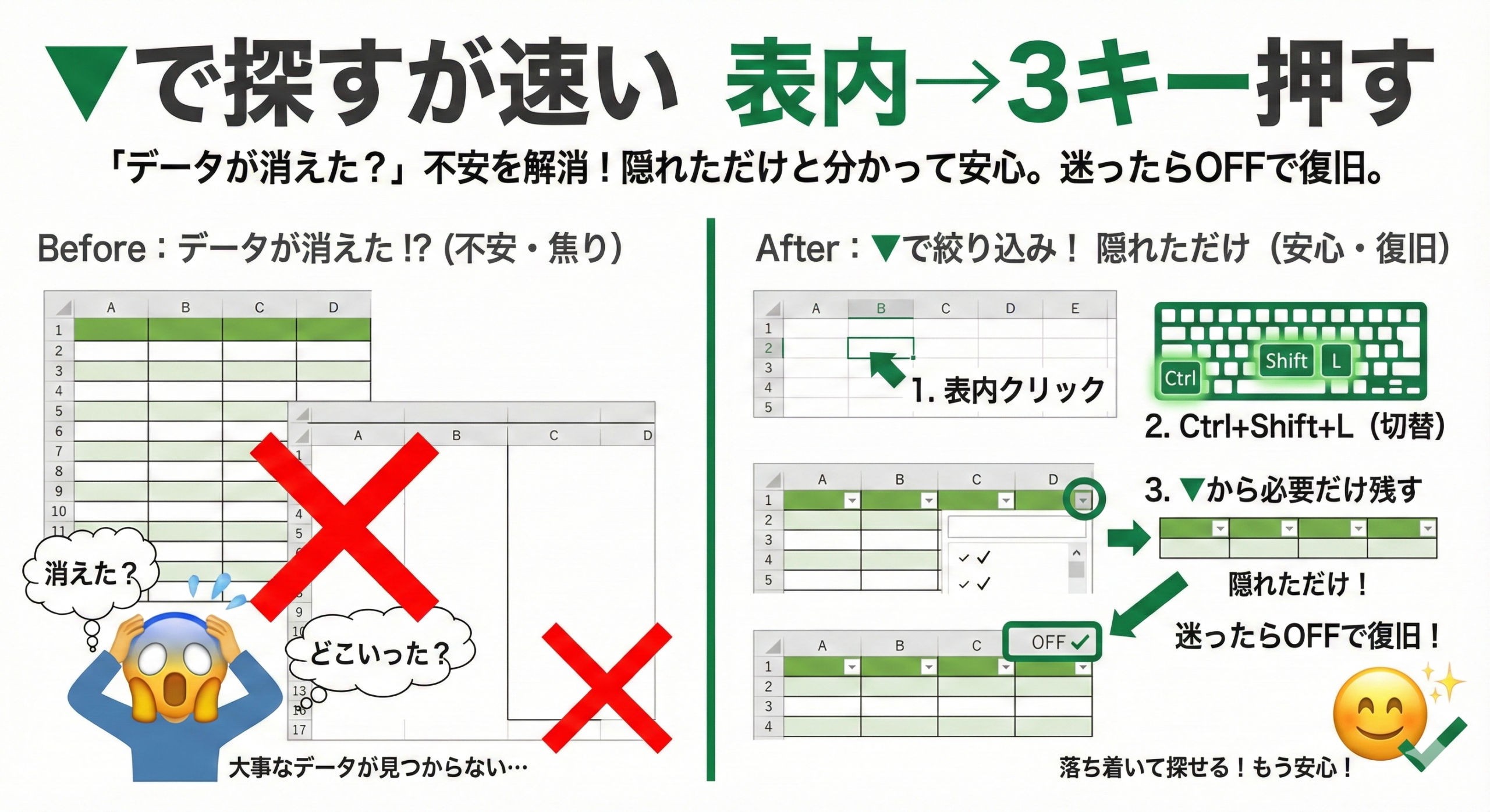パート B:OFF で安全に復旧 5. 焦らずに Ctrl+Shift+L で OFF 6. 全行が表示される確認 7. 「隠れてただけ」と理解
