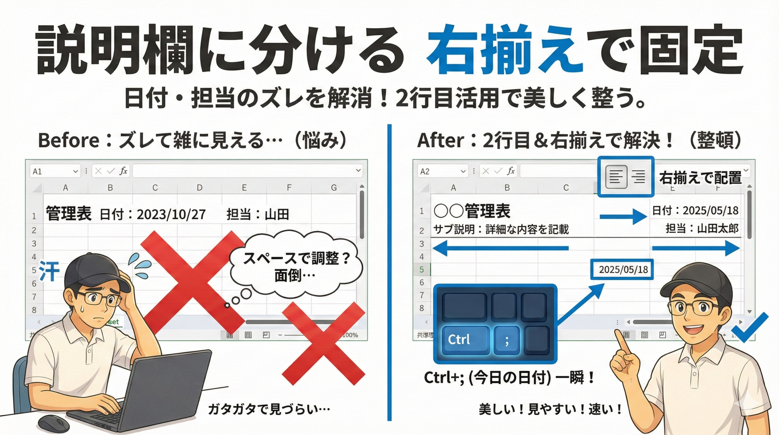パート B:右揃えで修正 4. F2 をクリック 5. Backspace でスペース削除 6. 残した日付に Ctrl+; で正しい日付に 7. 右揃えボタンをクリック 8. ズレが直った確認