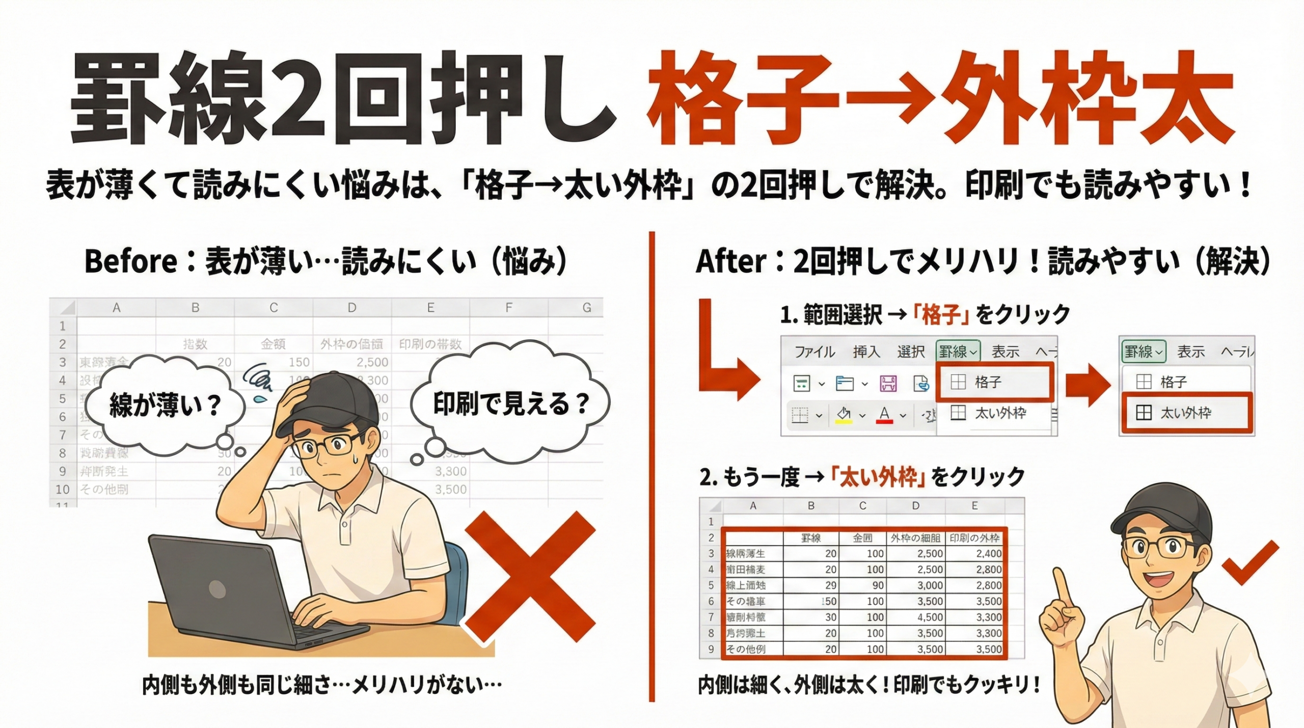 解決:「格子 → 太い外枠」の 2 ステップで完成