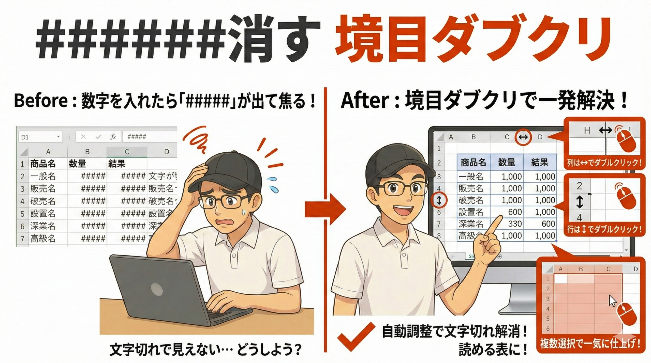 | 「#####」表示 | 列幅が狭い | 列境目 ↔ でダブルクリック |
