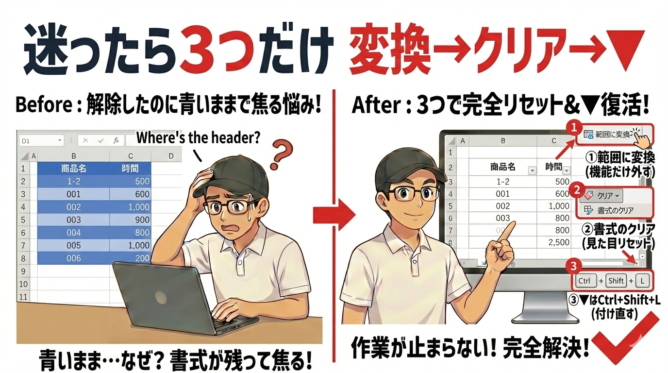 解決:「範囲に変換」で落ち着いて戻す