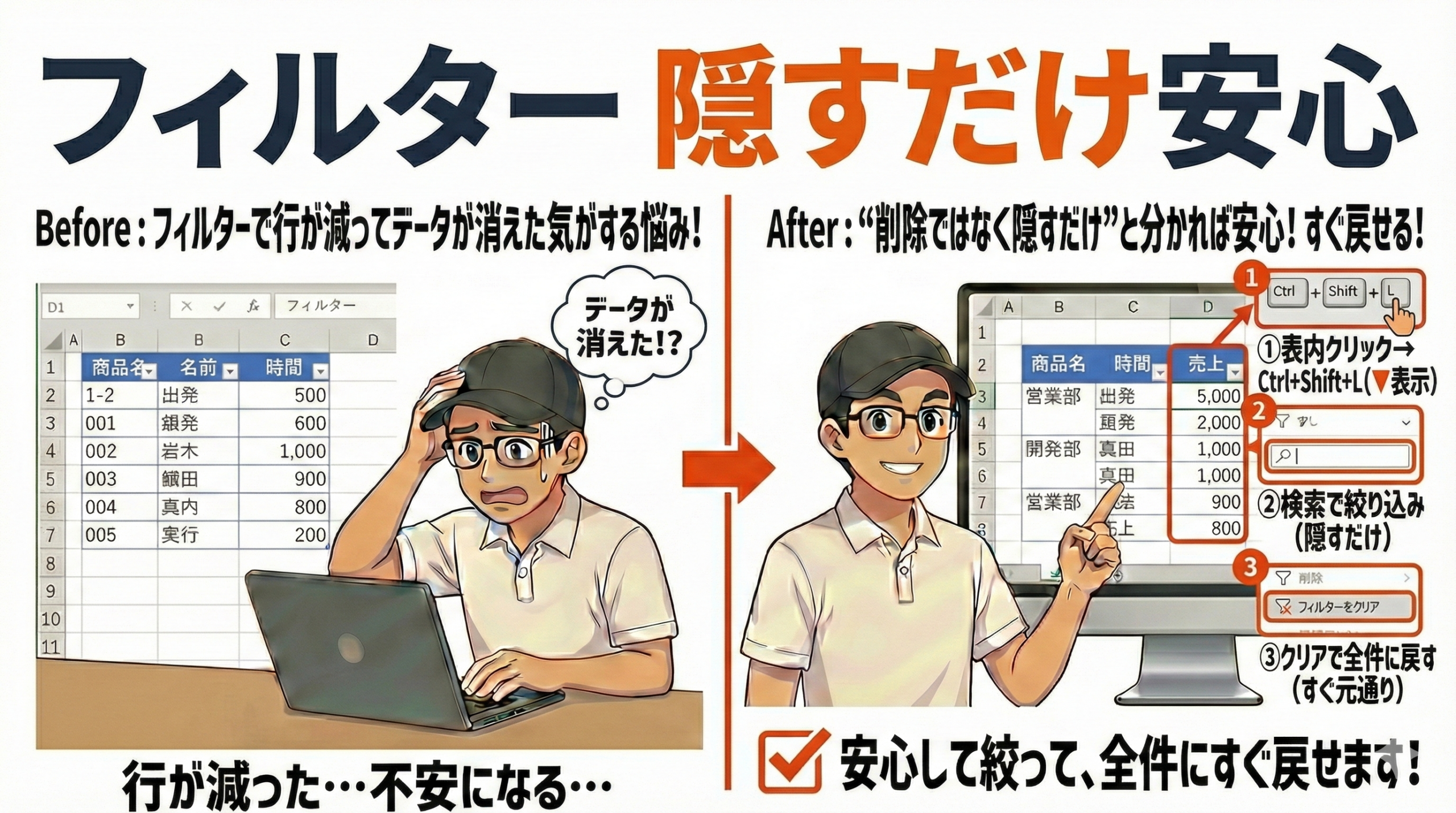 「不要な行を一時的に隠すだけ。データは残ったまま。」