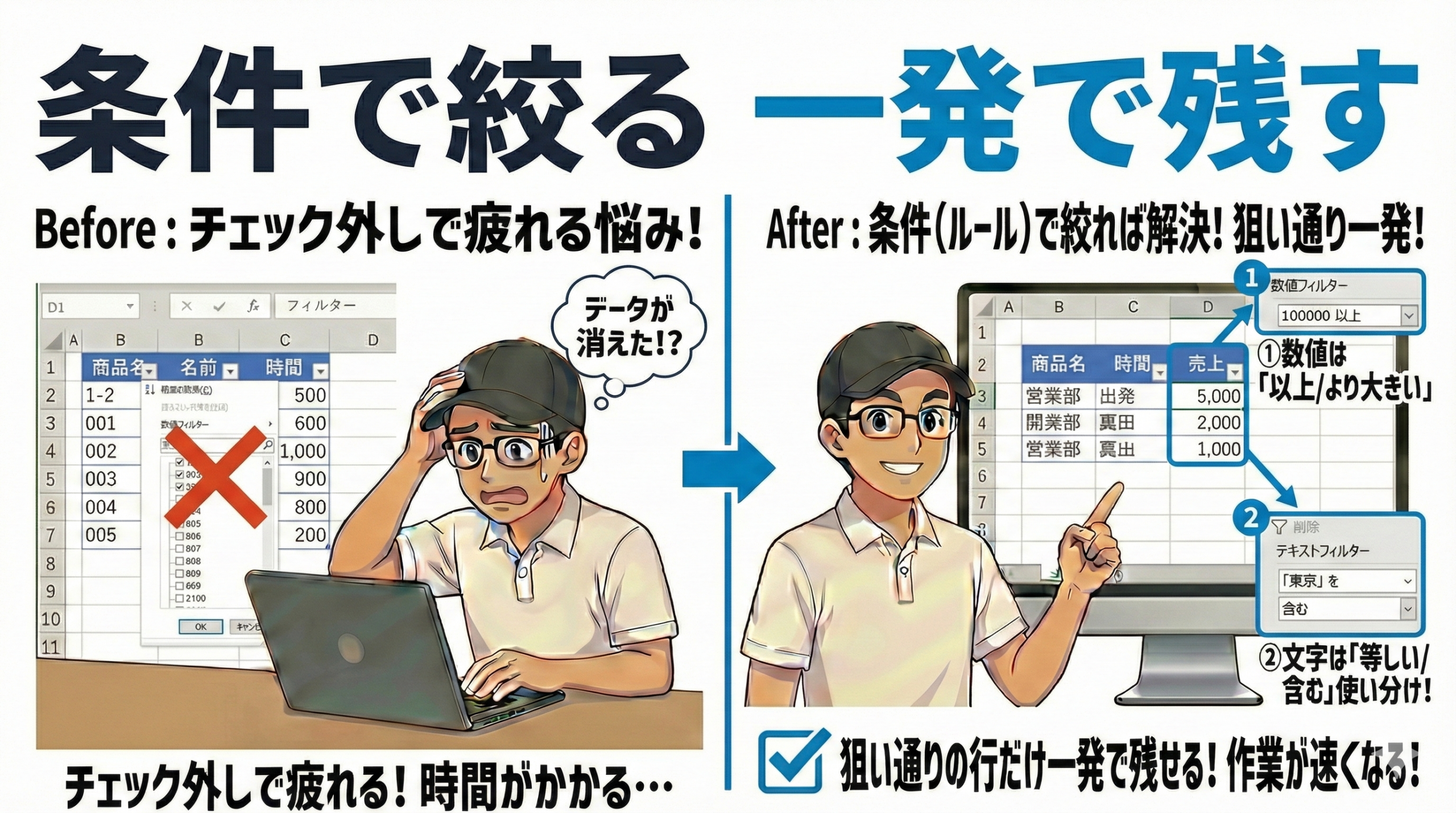 | 条件フィルター | 速い | 確実 |
